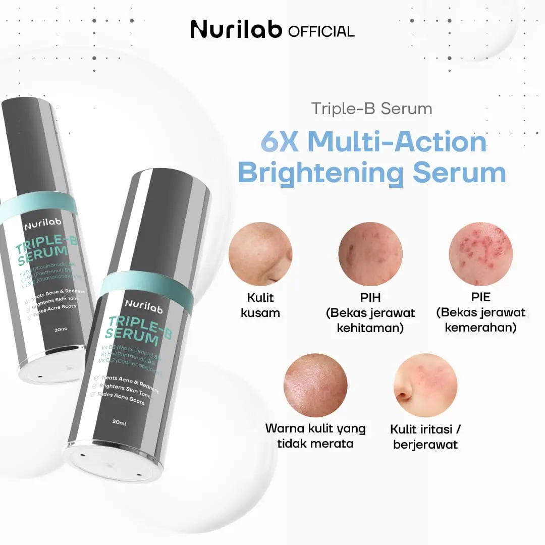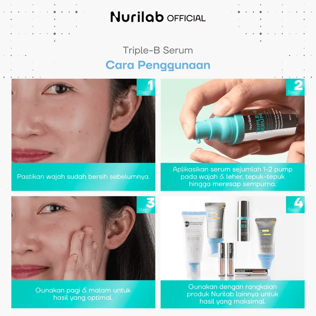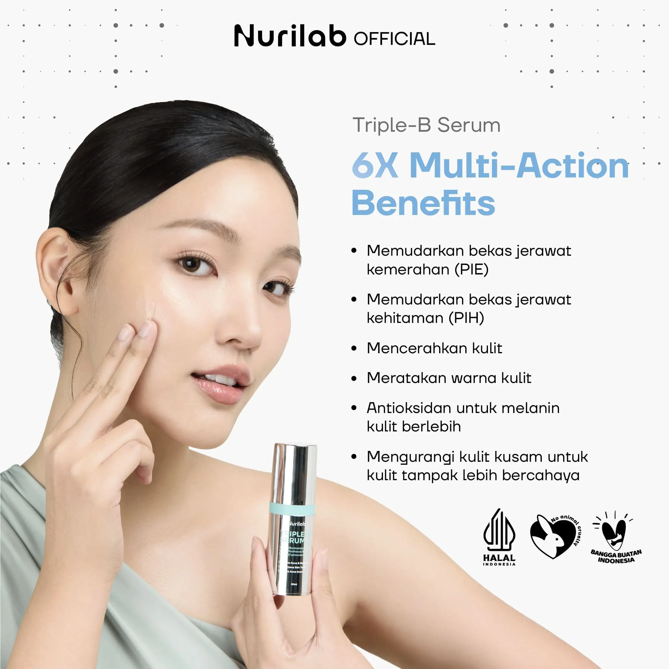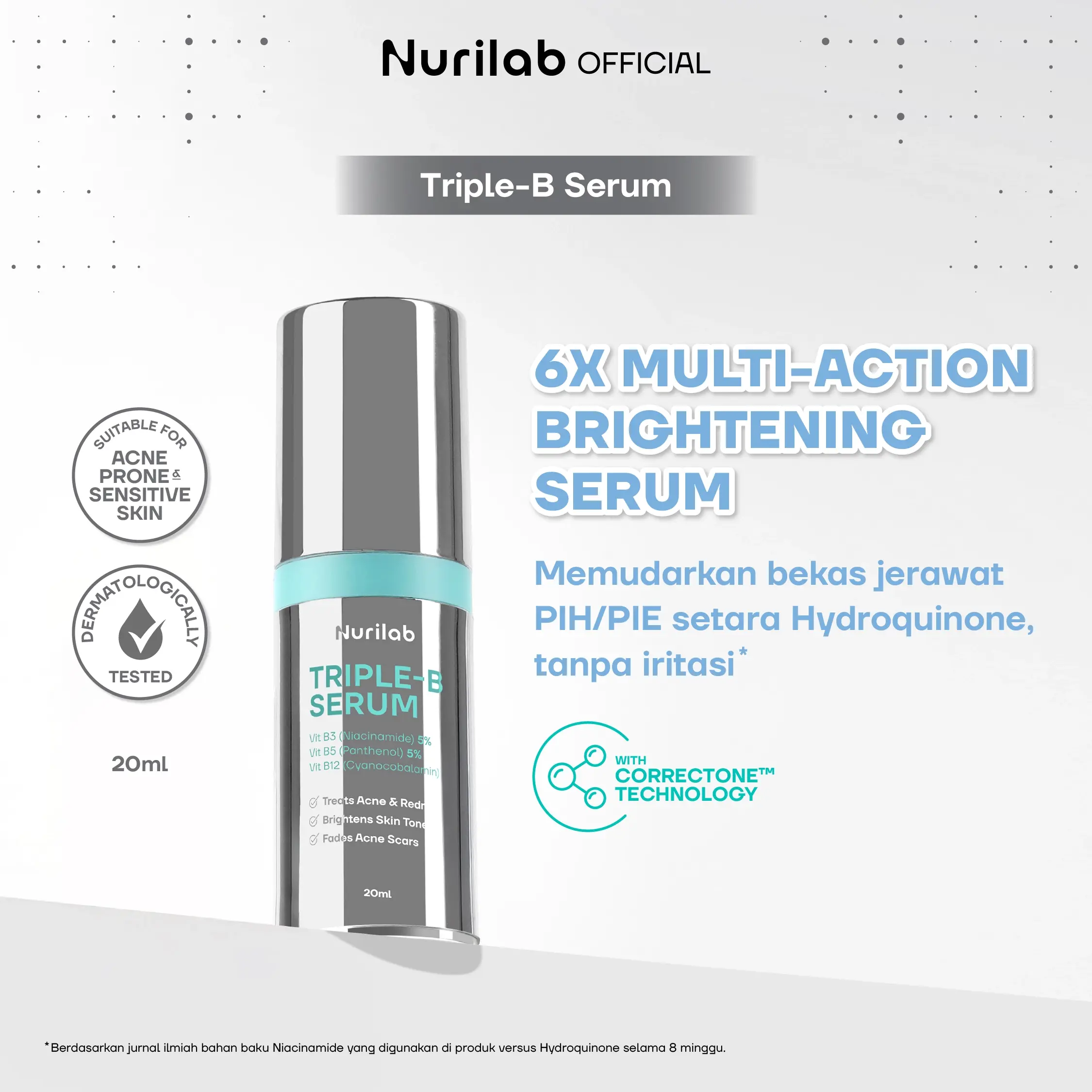 Nurilab Triple-B Serum merupakan brightening serum inovatif yang mengkombinasikan 10% Triple Vitamin B yang terdiri atas 5% Vitamin B3 (Niacinamide), 5% Vitamin B5 (Panthenol) dan Vitamin B12 (Cyanocobalamin), & CorrecTone Technology.