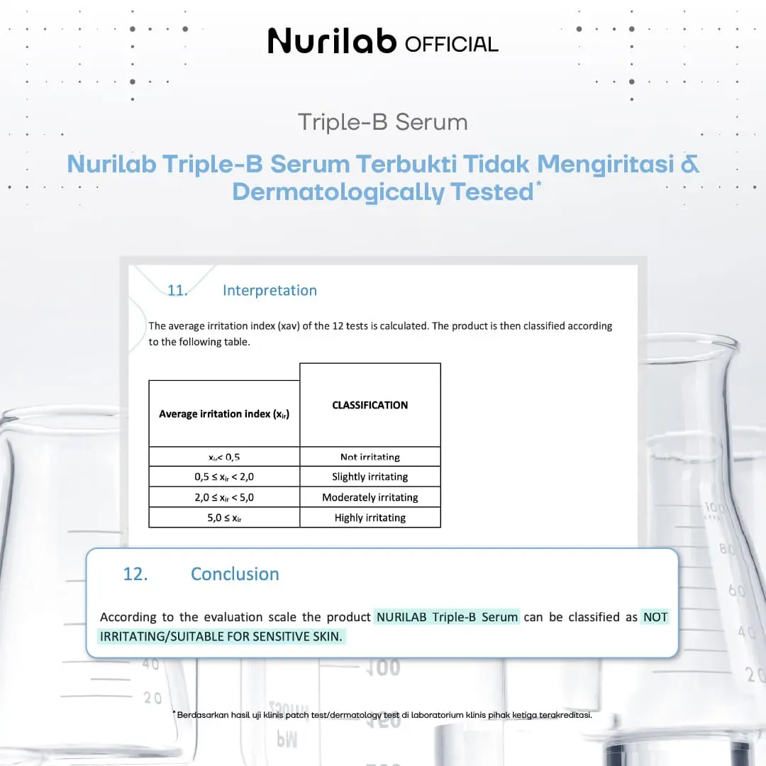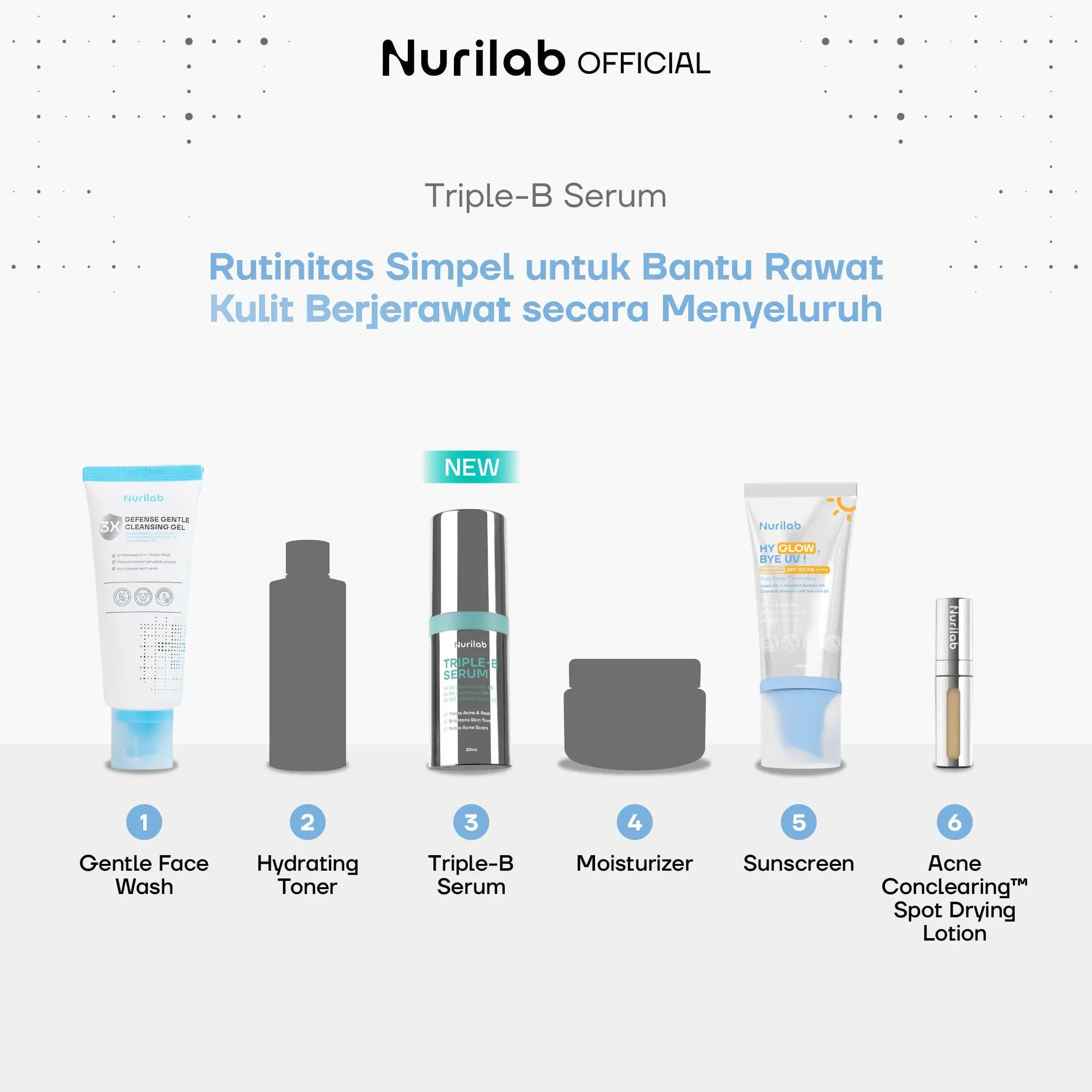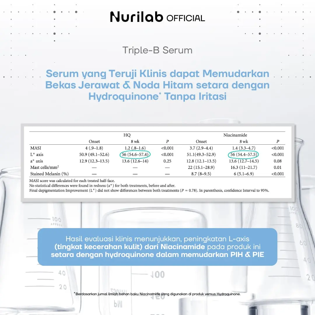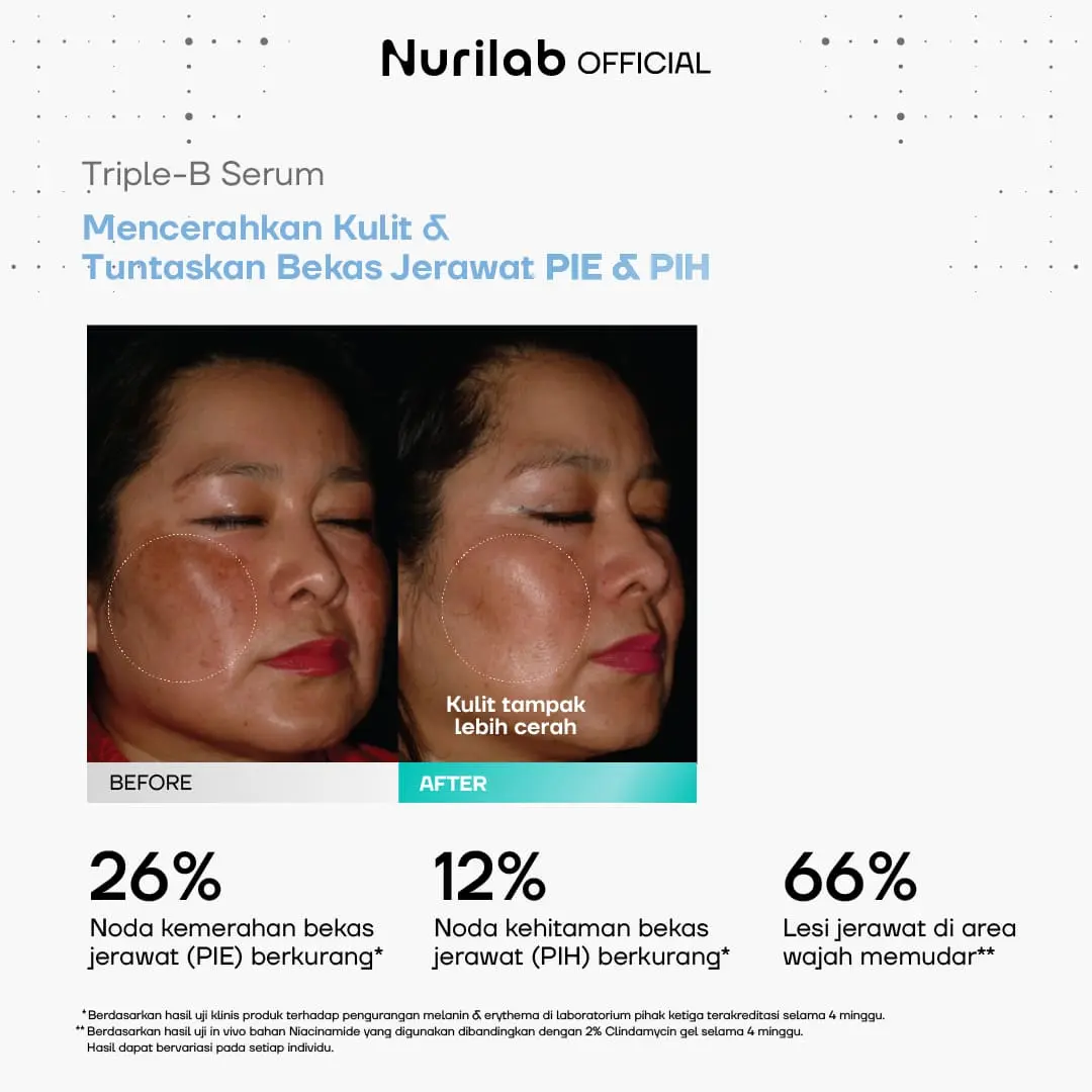 Nurilab Triple-B Serum merupakan brightening serum inovatif yang mengkombinasikan 10% Triple Vitamin B yang terdiri atas 5% Vitamin B3 (Niacinamide), 5% Vitamin B5 (Panthenol) dan Vitamin B12 (Cyanocobalamin), & CorrecTone Technology.